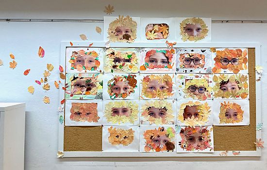 Die Schüler*innen zeigen sich in ungewöhnlichen Selbstporträts, welche mehr vom Gesicht verbergen, als sie offenlegen. Nur ihre Augenpaare sind in einem Haufen oder Kranz von Blättern zusammen mit anderen Tier-und Pflanzendarstellungen mehr oder weniger sichtbar. Trotzdem sind sehr individuelle und unverkennbare Porträts der einzelnen Schüler*innen entstanden. Alle vorher selbst angefertigten Blätter und Einzelteile wurden mittels der Technik der Collage zu einem neuen Ganzen zusammengesetzt.