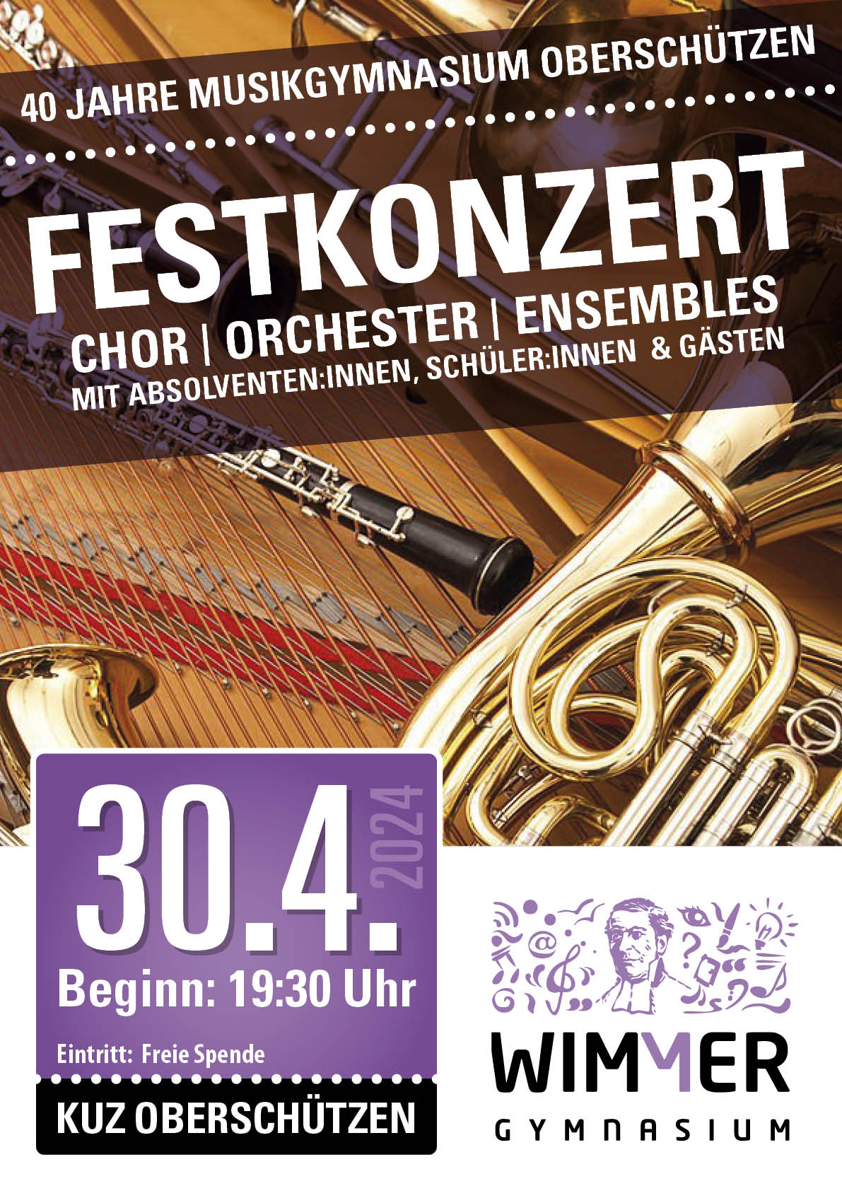 Im Rahmen dieses Festkonzertes zum Jubiläum soll der Wirkungskreis und nachhaltige Wirkungsgrad der Ausbildung am Musikgymnasium für das Kulturland Burgenland und sein Kulturschaffen einer breiten Öffentlichkeit vermittelt werden. Zum einen werden Absolvent:innen zu hören sein, die im internationalen Musikgeschäft tätig sind (Wiener Philharmoniker, Wiener Volksoper, etc.), zum anderen Absolvent:innen, die zu wichtigen Säulen der burgenländischen, steirischen und niederösterreichischen Musikausbildung zählen (Musikschuldirektor:innen, Musikschullehrer:innen, Musikerzieher:innen, etc.).