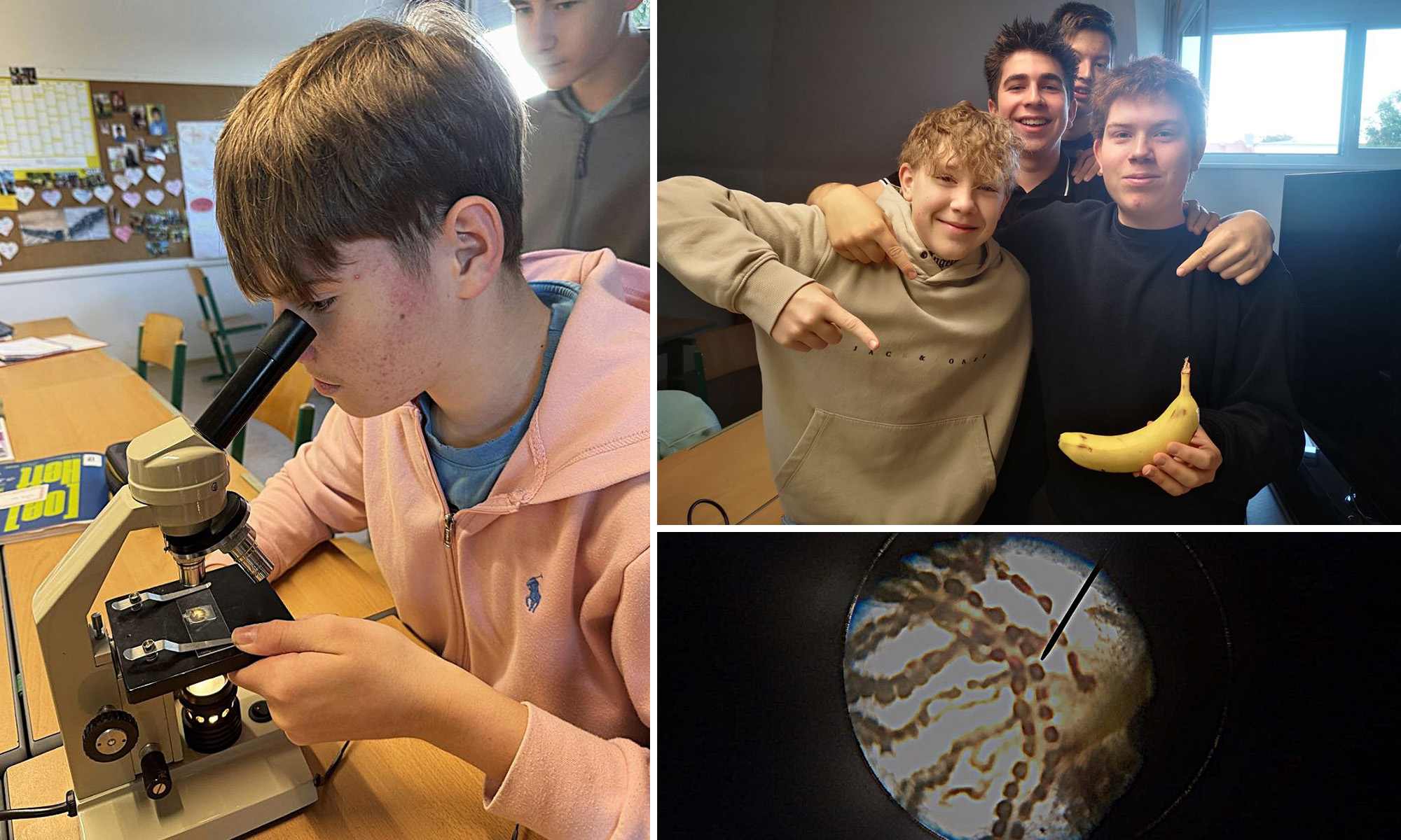 Die Übereinstimmung der Erbsubstanz zwischen Banane und Mensch beträgt rund 55 Prozent! Doch nicht nur diese genetische Verwandtschaft ist bemerkenswert - auch die Bananen-DNA selbst überzeugt durch ihre gute Sichtbarkeit unter dem Mikroskop. Diese durften die Schülerinnen und Schüler der 5. Klassen im Rahmen des Biologieunterrichts eigenständig erforschen.