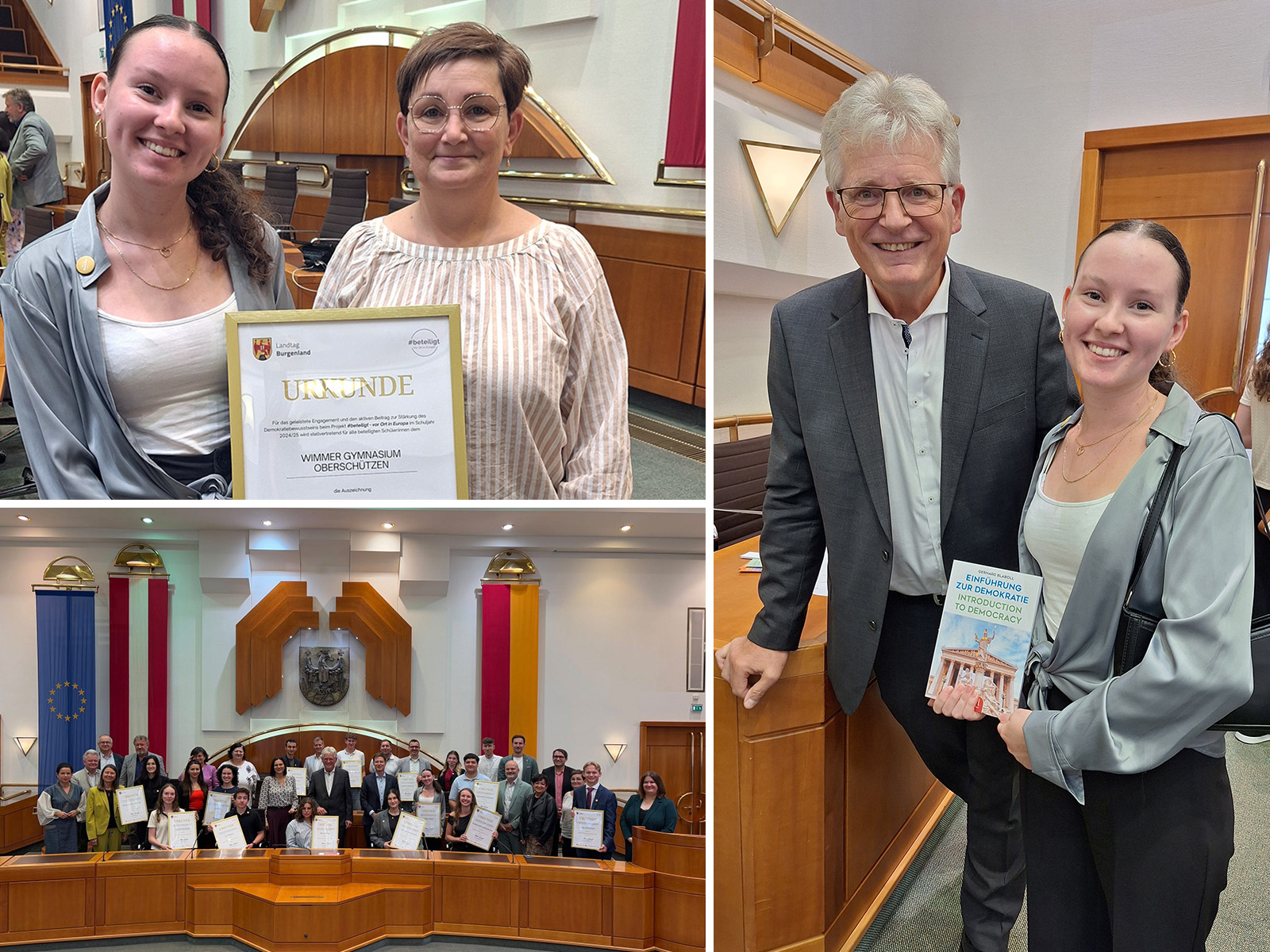 Als Zeichen der Anerkennung lud Landtagspräsidentin Astrid Eisenkopf anlässlich des "Tages der Demokratie" zu einem kleinen Festakt in den Landtagssitzungssaal ein. Stellvertretend für alle SchülerInnen des Wimmer Gymnasiums durfte Alice Tader (7A) die Auszeichnung "Demokratiebotschafter:in" entgegennehmen.