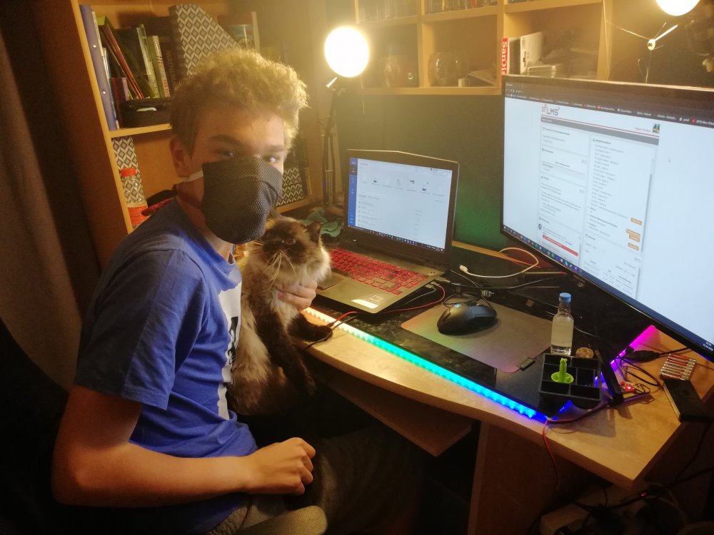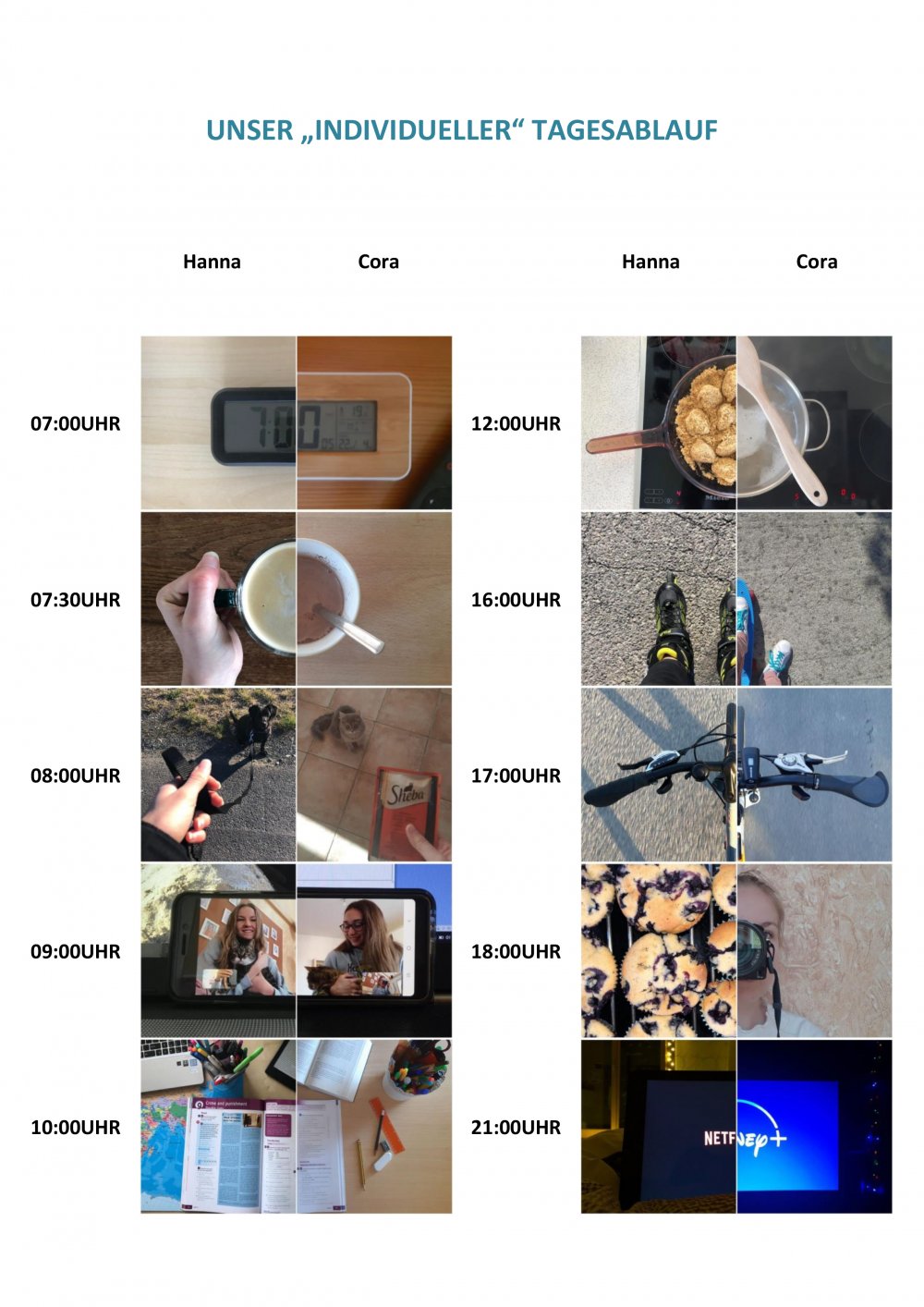 Zu Beginn fiel es mir ein wenig schwer, alles selbst zu organisieren. Es brauchte seine Zeit, bis ich meinen Rhythmus gefunden hatte. Von da an funktionierte alles eigentlich ganz gut. Ich entwickelte einen Tagesablauf, der sich von Montag bis Freitag durchzieht. Aufstehen, Katzen füttern, gemeinsam mit Hanna über Videotelefonat Hausübungen erledigen, kochen, essen, kurze Pause (oder wie ich zur wartenden Hanna immer sage: „chün") und noch etwas für die Schule erledigen. Am späten Nachmittag habe ich dann meist Zeit für ein paar Freizeitbeschäftigungen. Meist Radfahren oder Spazierengehen, am Abend ein wenig fernsehen. (Cora Zedl)