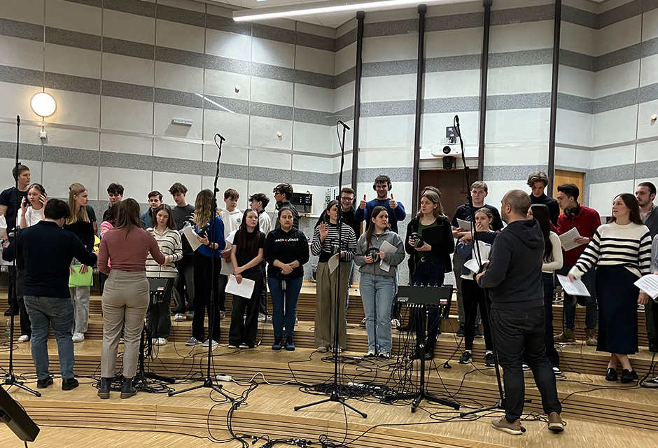 Auf Einladung des Instituts Oberschützen, das heuer sein 60-jähriges Bestehen feiert, reiste der Chor des Musikgymnasiums nach Graz, um im Tonstudio der Kunstuniversität den Chorpart von drei berühmten Filmmusikwerken aufzunehmen. Mit Kopfhörern ausgestattet mussten die Schüler:innen zur Orchester-Tonspur ihre Stimmen einsingen. Sie meisterten diese ungewohnte Art des Musizierens ausgezeichnet, stellten sich flexibel auf die jeweilige Situation ein und ernteten am Ende großes Lob vom Dirigenten.