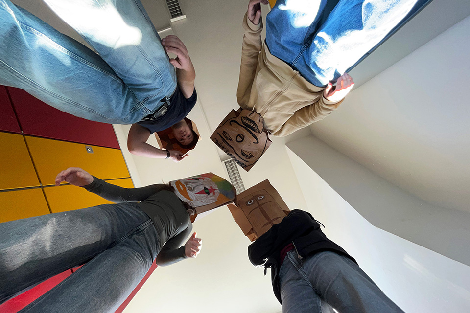 Nachdem sich die Schüler*innen auf die Thematik eingestimmt hatten, kreierten sie ihre eigene "Mask Series", indem sie selbst Papiertütenmasken gestalteten und sich damit in Kleingruppen im Schulgebäude und auf dem Schulgelände fotografisch in unterschiedlichen Rollen in Szene setzten. Um die vielfältigen Möglichkeiten fotografischer Inszenierung besser kennenzulernen, experimentierten sie dabei mit verschiedenen Kameraperspektiven und Einstellungsgrößen. Die Ergebnisse haben - ähnlich wie die Fotos der originalen Serie - je nach Maskierung und Pose eine teils komische, teils irritierende oder sogar unheimliche Wirkung auf den Betrachter.