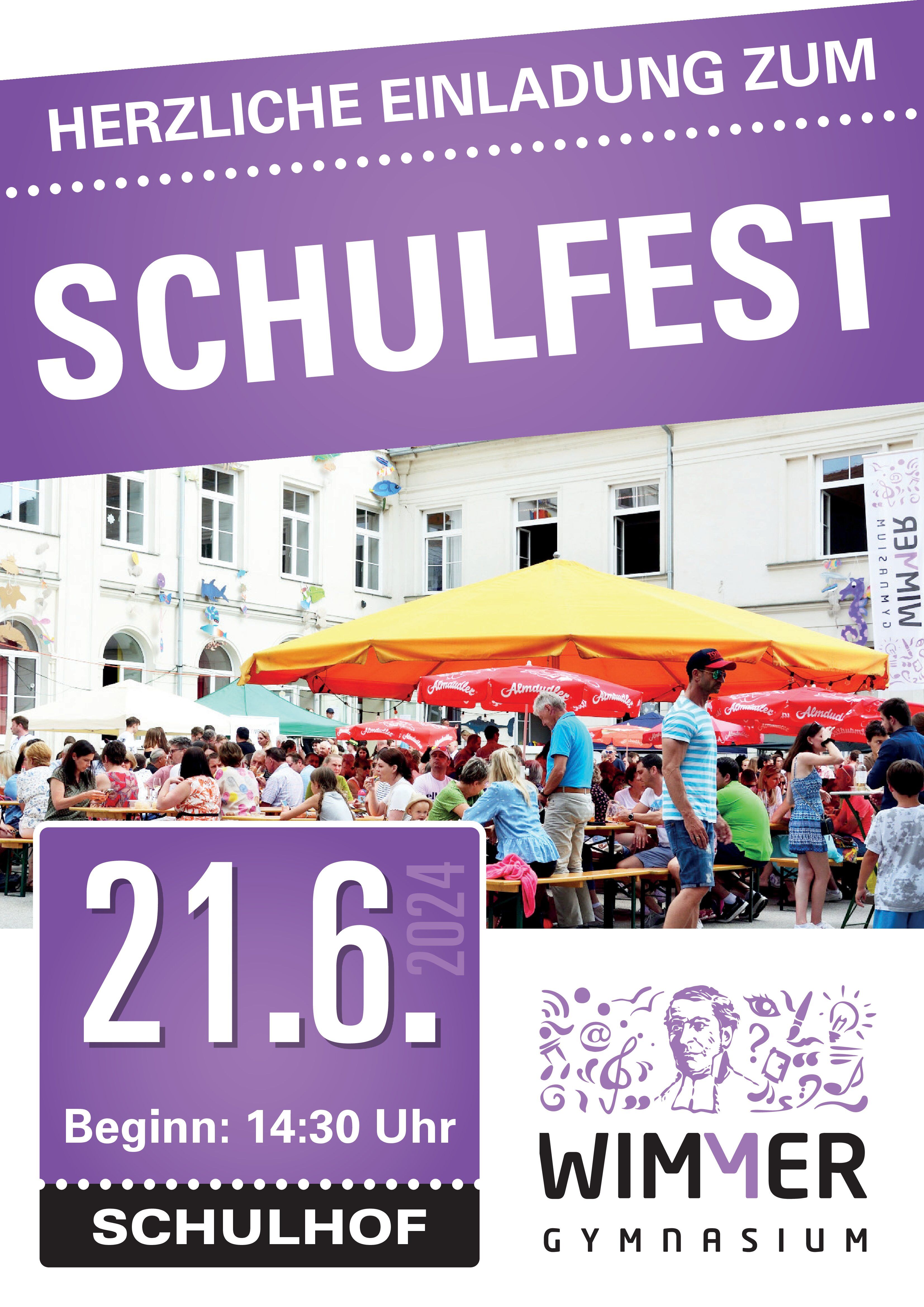 Das Wimmer Gymnasium lädt am Freitag 21. Juni 2024 zum diesjährigen Schulfest ein. Ab 14:30 wird auf dem Schulhof von den Schülerinnen und Schülern sowie von Lehrern und Lehrerinnen ein abwechslungsreiches und unterhaltsames Programm geboten.
