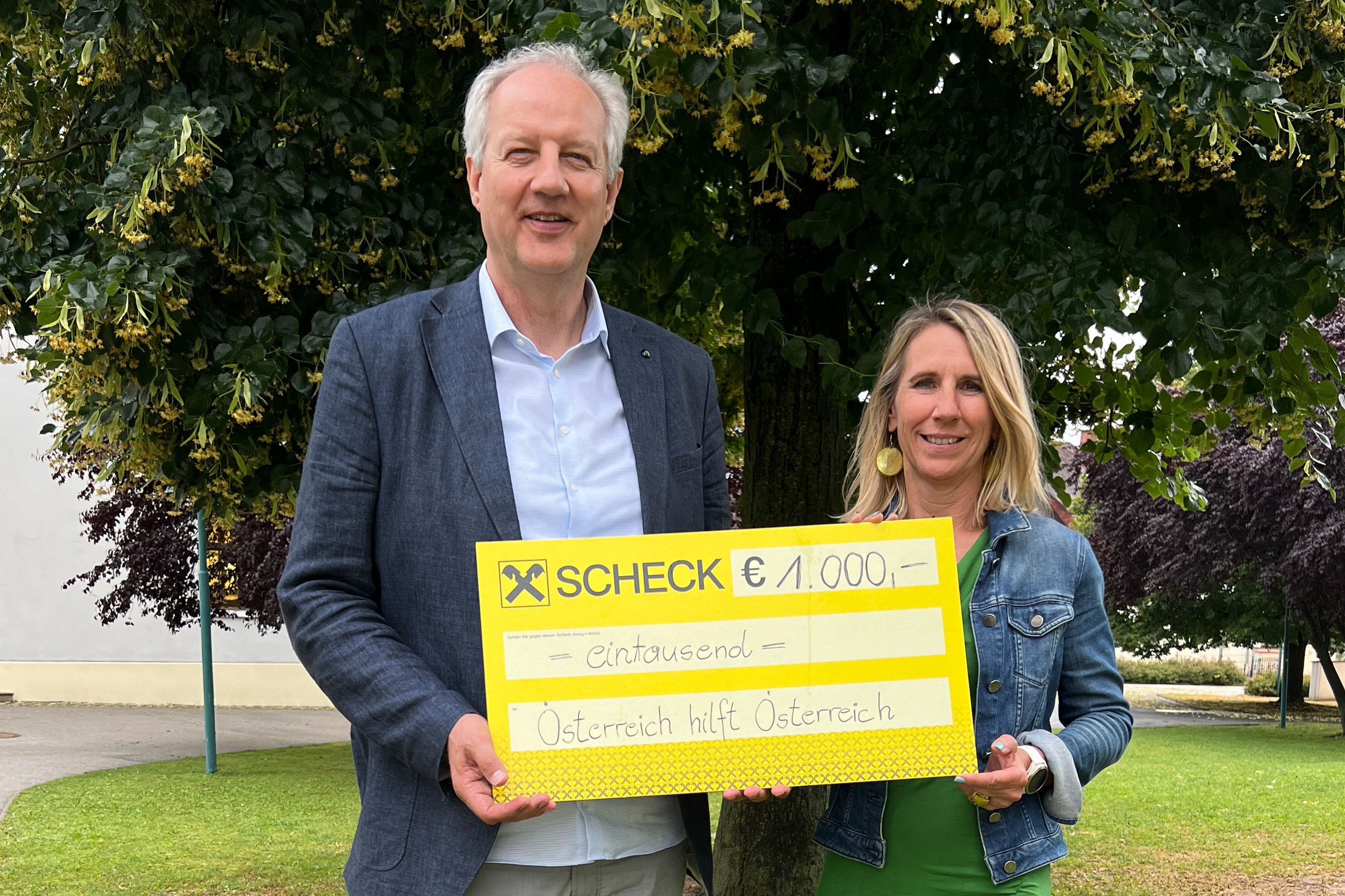 Das Wimmer Gymnasium hat im Zuge des Schulfestes für die Hochwasseropfer in Österreich Spenden gesammelt. Direktor Klaus Pahr freut sich, den Spendenbetrag von EUR 1000,-- an "Österreich hilft Österreich" übergeben zu können.