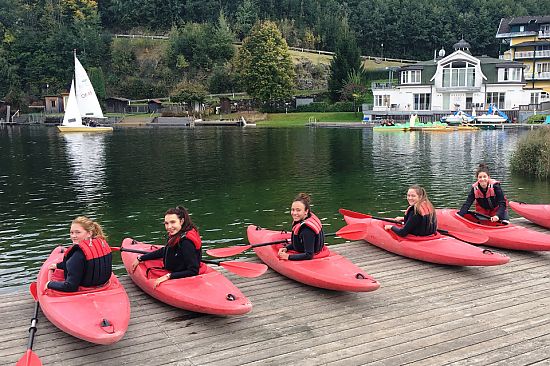 Von 25.-29. Septemer befanden sich unsere Schülerinnen und Schüler auf Sportsprachwoche in Seeboden am Millstättersee. Die herbstlichen Temperaturen taten der Stimmung unserer Schüler keinen Abbruch. Neben Sportarten wie Segeln, Kajak, Mountainbike, Beach Volleyball, Klettern und Tanzen kam auch die englische Sprache nicht zu kurz. Vormittags standen täglich eineinhalb Stunden Englisch auf dem Programm, welcher von Native Speakern der Sprachschule „Berlitz" abgehalten wurde. Topics wie Körpersprache, fremde Kulturen und Religionen wurden auf Englisch diskutiert. Am Nachmittag übernahmen die Sportlehrer des Hotels Royal X das Kommando und sorgten für den einen oder anderen Muskelkater. Zwischendurch gab es die Möglichkeit für viele sportliche Freizeitaktivtäten, wie Fitnesscenter, Tennis, Basketball, Fußball, Schwimmen, Tretbootfahren, Walken oder Laufen. Beim Beach Grand Slam Turnier in Seeboden, kämpften sowohl Burschen als auch Mädchen um den Titel. Die Fußballkenntnisse wurden beim Tipp-Spiel der Uefa Champions League unter Beweis gestellt. Erholung fanden die Schülerinnen und Schüler abends bei gemeinsamen Spielen, Champions League und Lagerfeuer.