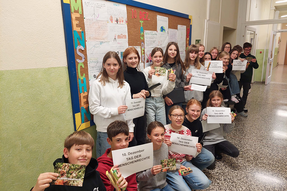 Mit und in Unterstützung von Fairtrade verteilten heute am 10. Dezember, am Tag der Menschenrechte, die Schüler*innen der 3. Klassen in der großen Pause insgesamt 100 fairgehandelte Fairettariegel in den Klassen. Auch wenn unsere Schüler nicht den genauen Wortlaut der einzelnen Artikel immer wiedergeben konnten, wussten sehr viele um ihre Rechte Bescheid. Im Vorfeld setzten sich die Schüler*innen mit dem Inhalt der Allgemeinen Erklärung der Menschenrechte auseinander und gestalteten dazu eine Pinnwand in der Schule.
