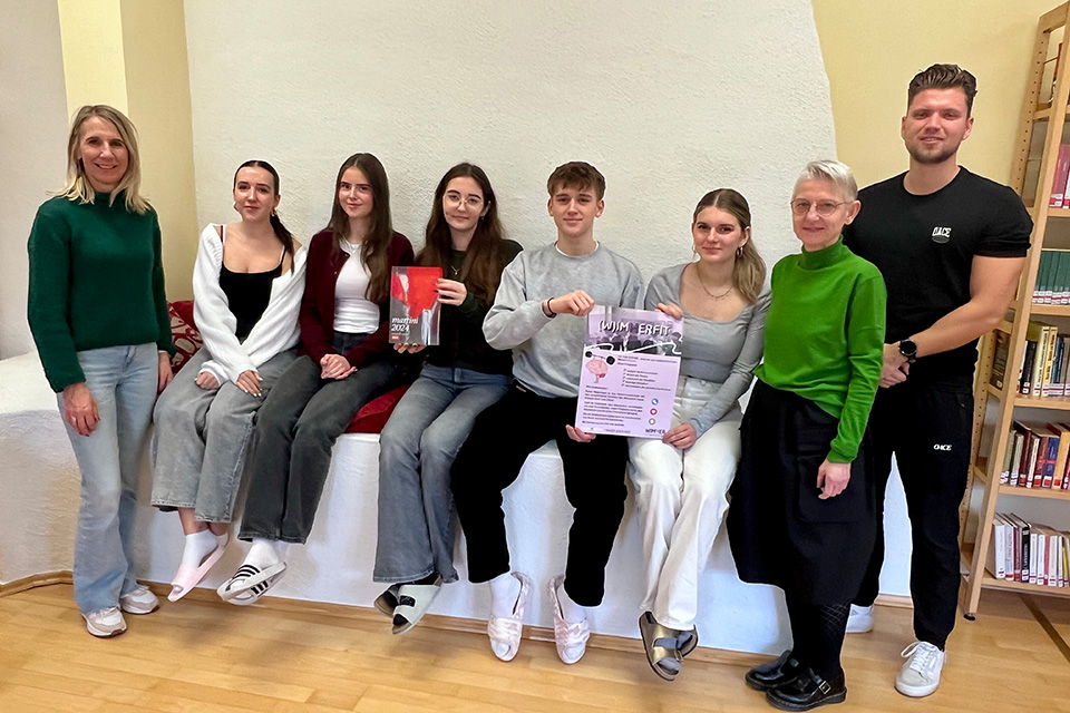 Die Aufregung war groß und die Spannung spürbar als sich die (W)immerfit-Coaches, Emi Nika, Jonathan Racz, Ilvy Spiola, Johanna Simon und Gloria Taucher zum Interview mit Bertie Unger, dem Leiter der BVZ Süd, in der Bibliothek trafen. Der Grund: (W)immerfit holte sich den begehrten BVZ Martinipreis 2024 in der Kategorie "Unsere Zukunft". Die BVZ plante dazu ein doppelseitiges Interview, das landesweit erscheint. Auch die verantwortlichen Lehrer*innen Karina Toth, Birgit Samer und Michael Nemeth waren mit dabei. Bertie Unger hatte viele Fragen im Gepäck, die nach und nach in der Runde beantwortet wurden. Die Aufgeregtheit wich durch die lockere Art der Fragestellung schnell der Begeisterung, derart ausführlich über (W)immerfit erzählen zu können und das Gesagte später schwarz auf weiß in der Zeitung zu lesen.
