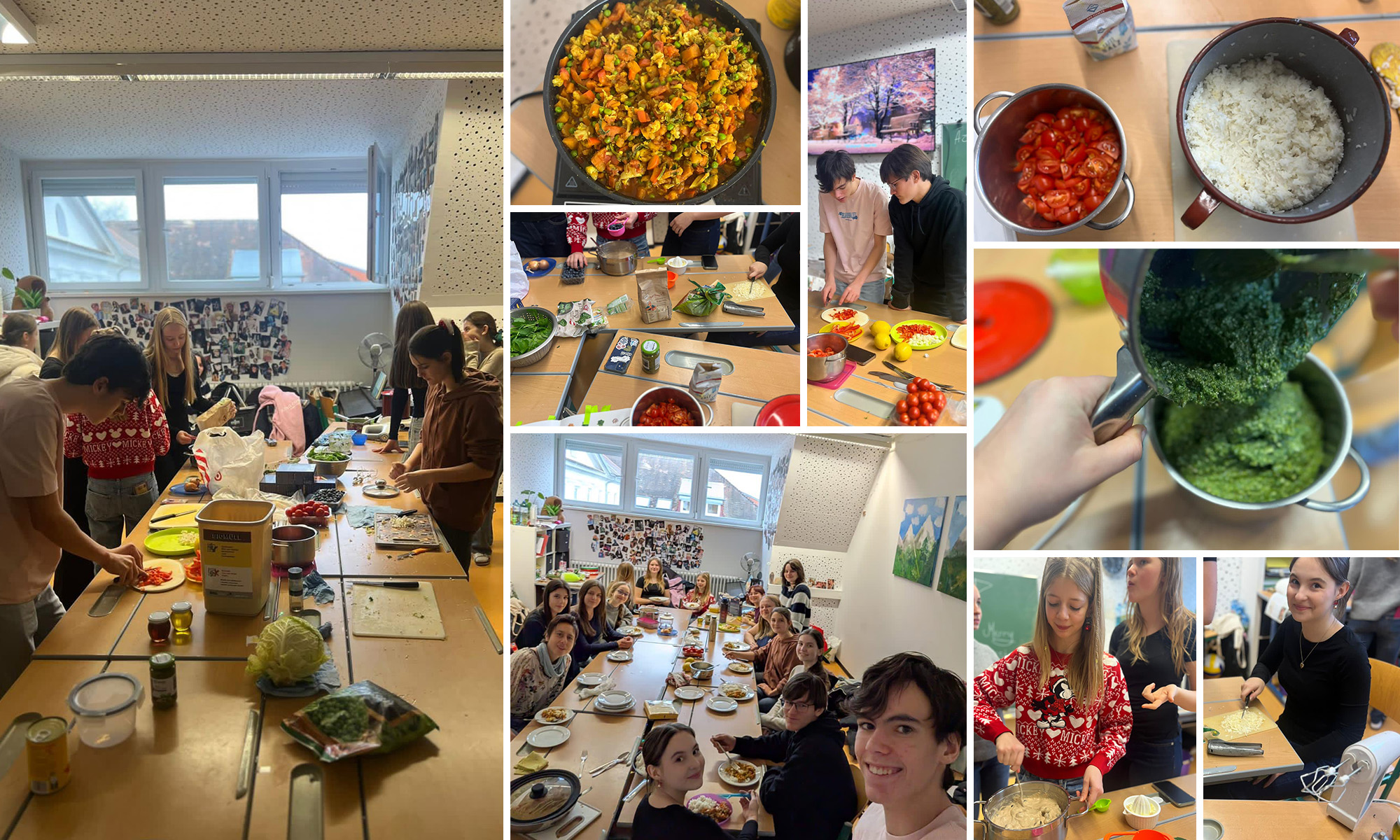 Im Englischunterricht war das Thema "Global warming in connection with meat consumption" besprochen worden, was die Schülerinnen und Schüler dazu inspirierte, vegane Fleischalternativen anhand eines englischen Kochbuches selbst auszuprobieren. Kurzerhand zur Küche umfunktioniert wurde der Klassenraum der 6A.
